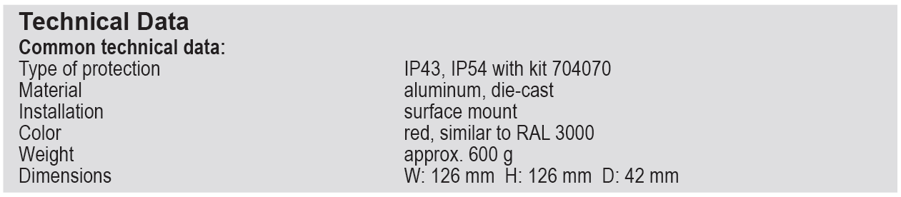 این محصول با بدنهای مقاوم از جنس آلومینیوم دایکست طراحی شده و برای نصب روکار مناسب است. درجه حفاظت دستگاه بهصورت استاندارد IP43 بوده و در صورت استفاده از کیت 704070 به سطح IP54 افزایش مییابد. رنگ بدنه قرمز و مشابه RAL 3000 است. وزن تقریبی آن ۶۰۰ گرم بوده و ابعاد آن ۱۲۶×۱۲۶×۴۲ میلیمتر میباشد که نصب آسان و دوام بالا را تضمین میکند.