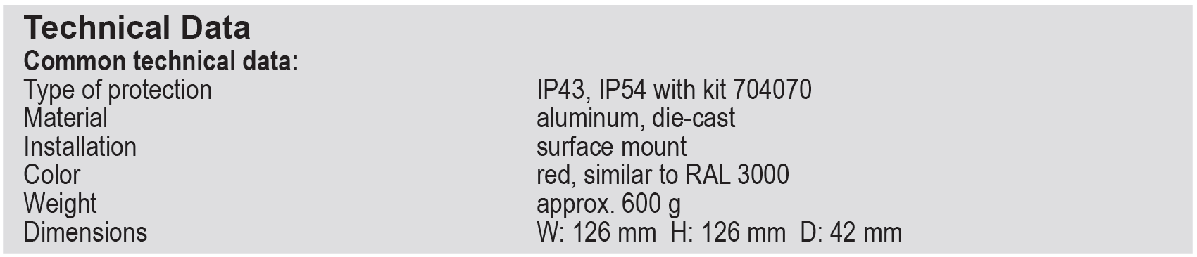 این تجهیز دارای بدنهای مقاوم از جنس آلومینیوم دایکست بوده و برای نصب روکار طراحی شده است. درجه حفاظت آن بهصورت استاندارد IP43 بوده و در صورت استفاده از کیت 704070 به IP54 ارتقا مییابد. رنگ بدنه قرمز و مشابه کد RAL 3000 است. وزن دستگاه حدود ۶۰۰ گرم بوده و با ابعاد ۱۲۶×۱۲۶×۴۲ میلیمتر، نصب آسان و دوام بالایی را فراهم میکند.