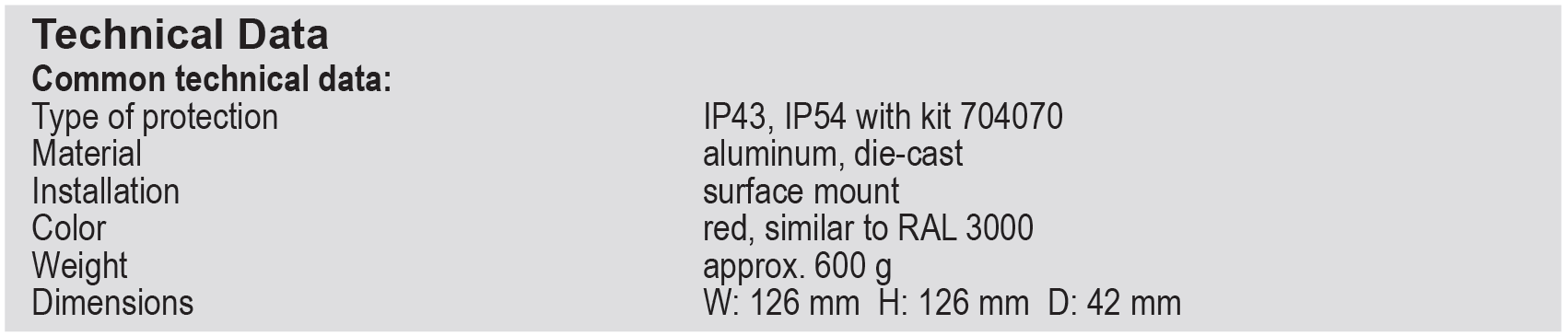 این محصول دارای بدنهای مقاوم از جنس آلومینیوم دایکست بوده و برای نصب روکار طراحی شده است. درجه حفاظت آن بهصورت استاندارد IP43 بوده و در صورت استفاده از کیت 704070 به IP54 ارتقا مییابد. این تجهیز در سه رنگ مختلف قرمز (مشابه RAL 3000)، آبی (مشابه RAL 5009) و زرد (مشابه RAL 1018) عرضه میشود تا متناسب با نیازهای مختلف پروژه قابل انتخاب باشد. وزن دستگاه حدود ۶۰۰ گرم بوده و ابعاد آن ۱۲۶×۱۲۶×۴۲ میلیمتر است که نصب آسان و استحکام مناسب را تضمین میکند.