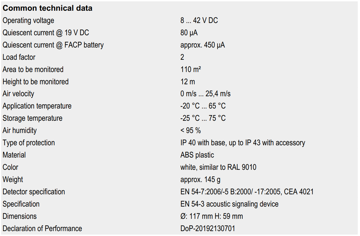 درجه حفاظت این دتکتور با استفاده از پایه IP40 بوده و در صورت بهکارگیری متعلقات جانبی تا IP43 قابل ارتقا است. بدنه دستگاه از پلاستیک ABS ساخته شده و رنگ آن سفید، مشابه RAL 9010 میباشد. وزن تقریبی دتکتور حدود ۱۴۵ گرم است و ابعاد آن ۱۱۷ میلیمتر قطر و ۵۹ میلیمتر ارتفاع دارد.