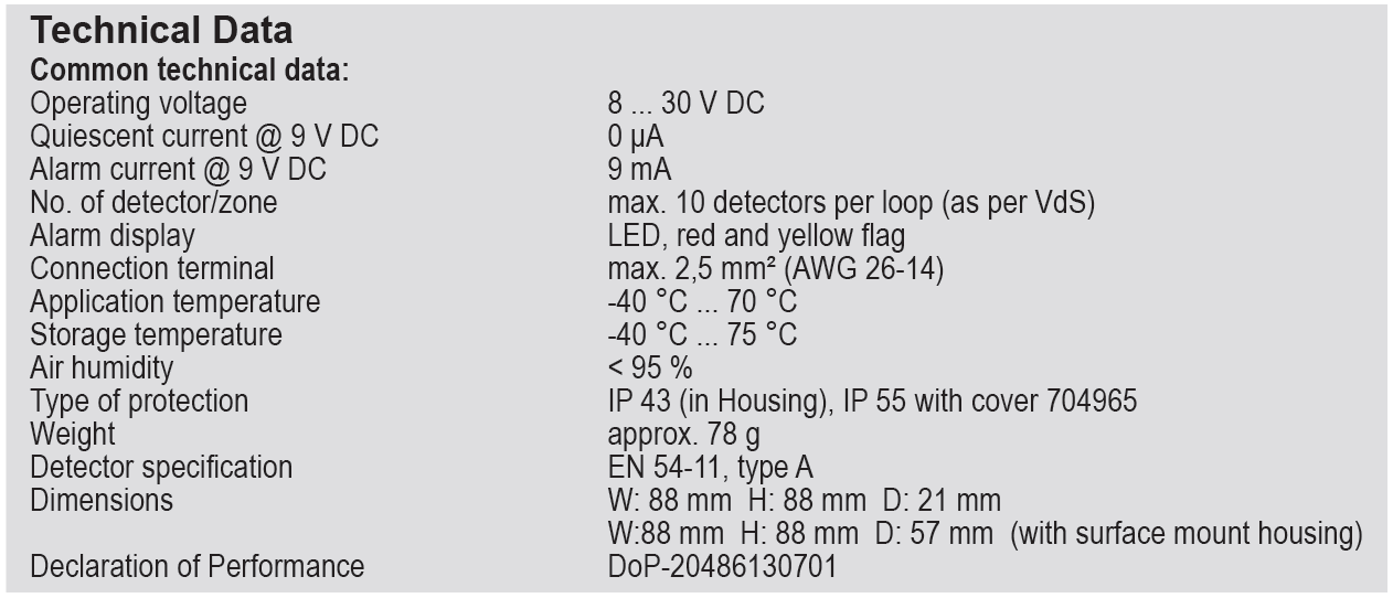 این شستی اعلام حریق با ولتاژ کاری 8 تا 30 ولت DC طراحی شده و در حالت عادی مصرف جریانی ندارد، اما در زمان آلارم با جریان حدود 9 میلیآمپر در ولتاژ 9 ولت DC عمل میکند. امکان اتصال حداکثر 10 شستی در هر لوپ مطابق استاندارد VdS فراهم شده است. نمایش وضعیت آلارم از طریق LED قرمز بههمراه نشانگر زرد مکانیکی انجام میشود تا تشخیص وضعیت بهسادگی امکانپذیر باشد.