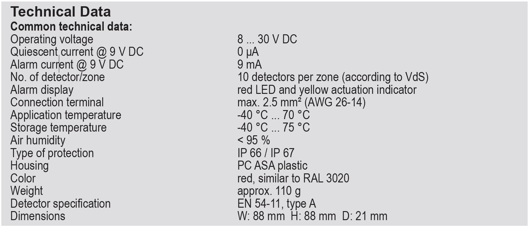 بدنه این دستگاه از پلاستیک مقاوم PC ASA به رنگ قرمز (مطابق با RAL 3020) ساخته شده و با وزن تقریبی ۱۱۰ گرم، در ابعاد استاندارد ۸۸ در ۸۸ میلیمتر طراحی شده است. از نظر ایمنی و دوام، این مدل با دارا بودن درجه حفاظت بسیار بالای IP66 / IP67، یک انتخاب ایدهآل برای محیطهای سخت و مرطوب است و میتواند در بازه دمایی گسترده ۴۰- تا ۷۰+ درجه سانتیگراد (با رطوبت تا ۹۵ درصد) بدون نقص عمل کند.