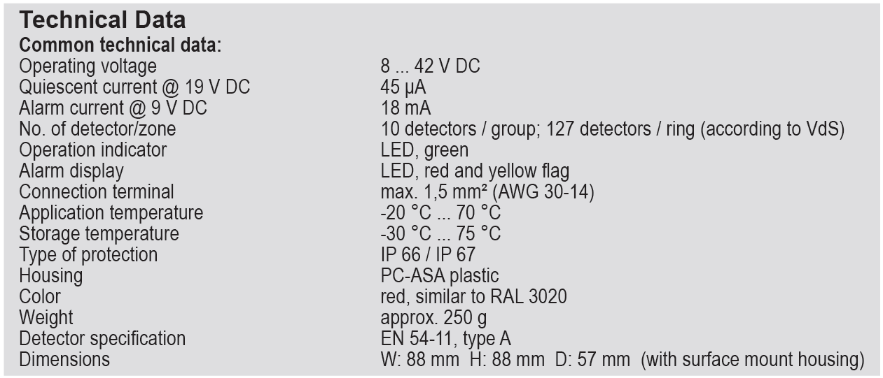 با برخورداری از درجه حفاظت بسیار بالای IP66 / IP67، بدنه ساختهشده از پلاستیک مقاوم PC-ASA و رنگ قرمز (مشابه RAL 3020)، این محصول انتخابی ایدهآل برای فضاهای بیرونی و محیطهای صنعتی است. وزن دستگاه حدود 250 گرم بوده و با ابعاد 88×88×57 میلیمتر (بههمراه باکس روکار)، مطابق استاندارد EN 54-11 نوع A تولید شده است.