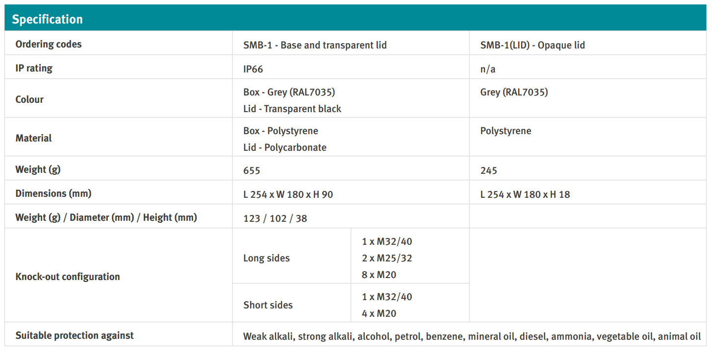 محفظه SMB-1 یک باکس با پایه و درب شفاف مشکی یا درب مات اختیاری است که با استاندارد IP66 مقاوم در برابر آب و گرد و غبار طراحی شده است. این محفظه به رنگ خاکستری (RAL7035) ساخته شده و بدنه آن از پلیاستایرن و درب از پلیکربنات است. ابعاد باکس ۲۵۴×۱۸۰×۹۰ میلیمتر و وزن آن ۶۵۵ گرم است و دارای نقاط خروج کابل متنوع شامل M20، M25، M32 و M40 بر روی لبههای بلند و کوتاه میباشد. این محصول مقاومت خوبی در برابر مواد شیمیایی مانند قلیاهای ضعیف و قوی، الکل، بنزین، بنزن، روغنهای معدنی و حیوانی و آمونیاک دارد و برای نصب امن تجهیزات در محیطهای صنعتی و حساس مناسب است.