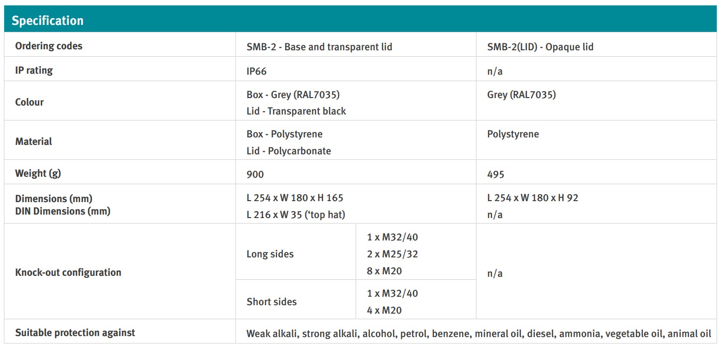 مدل SMB-2 یک محفظه با درجه حفاظتی IP66 و رنگ خاکستری (RAL7035) است که برای استفاده با مجموعه ماژولهای DIN شرکت Hochiki طراحی شده است. این محفظه دارای چندین خروجی کابل (knock-out) متریک بوده و بهصورت استاندارد با درب شفاف مشکی عرضه میشود؛ همچنین درب مات خاکستری مدل SMB-2(LID) بهصورت جداگانه قابل تهیه است.